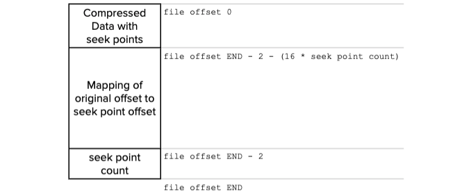 As the file is being compressed, the seek point index records the original uncompressed offset with the new compressed offset creating a mapping so that the original index values (uncompressed offsets) can be mapped to the nearest seek point before the uncompressed offset. This dramatically reduces the seek time to parts of the uncompressed file that appear later in the stream.